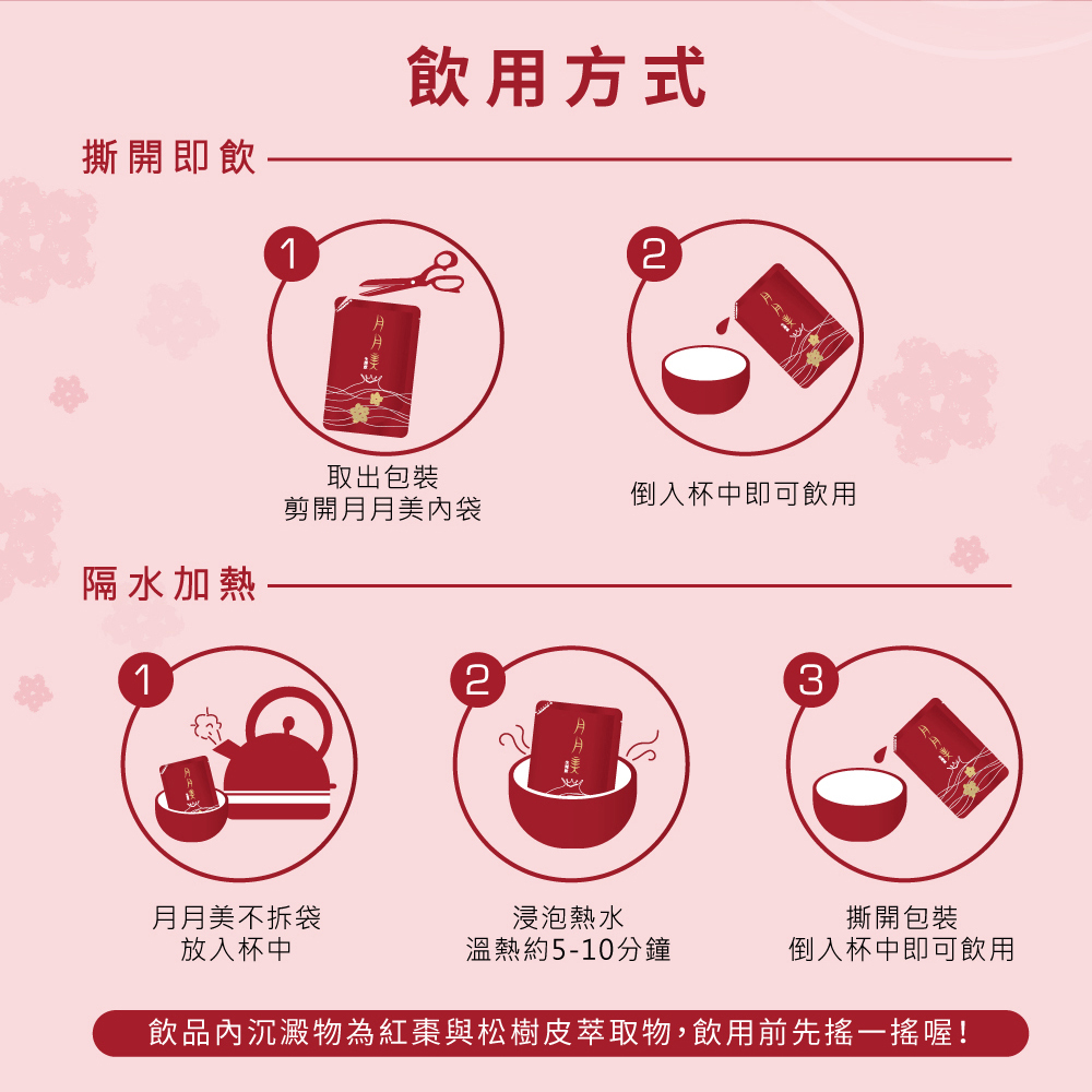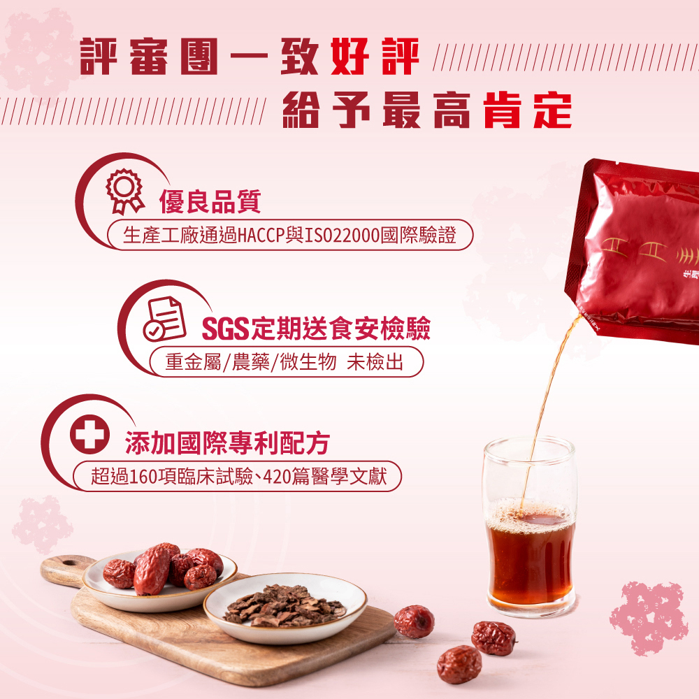 | 注意事項 | 本產品沉澱物為碧容健(松樹皮萃取物)與紅棗萃取物,屬自然現象請安心食用。本產品包裝不可微波,如有破損或膨脹請勿飲用。高血壓、糖尿病或有特殊體質者,請先諮詢醫師、營養師、藥師。 |