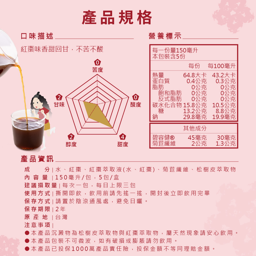 | 商品成分 | 水、紅棗、紅棗萃取液(紅棗、水)、菊苣纖維、松樹皮萃取物 |