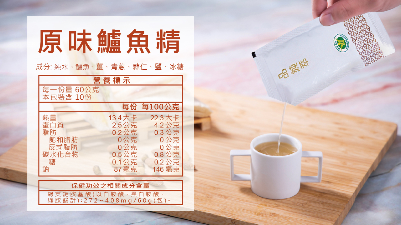 | 商品成分 | 純水、鱸魚 、 嫩薑、老薑、青蔥、蒜仁、鹽、冰糖;總支鏈胺基酸:272-408mg/每包 |