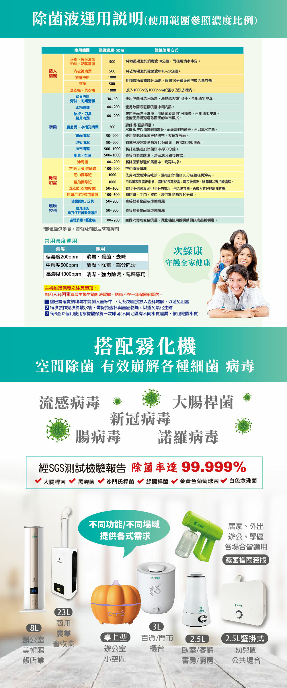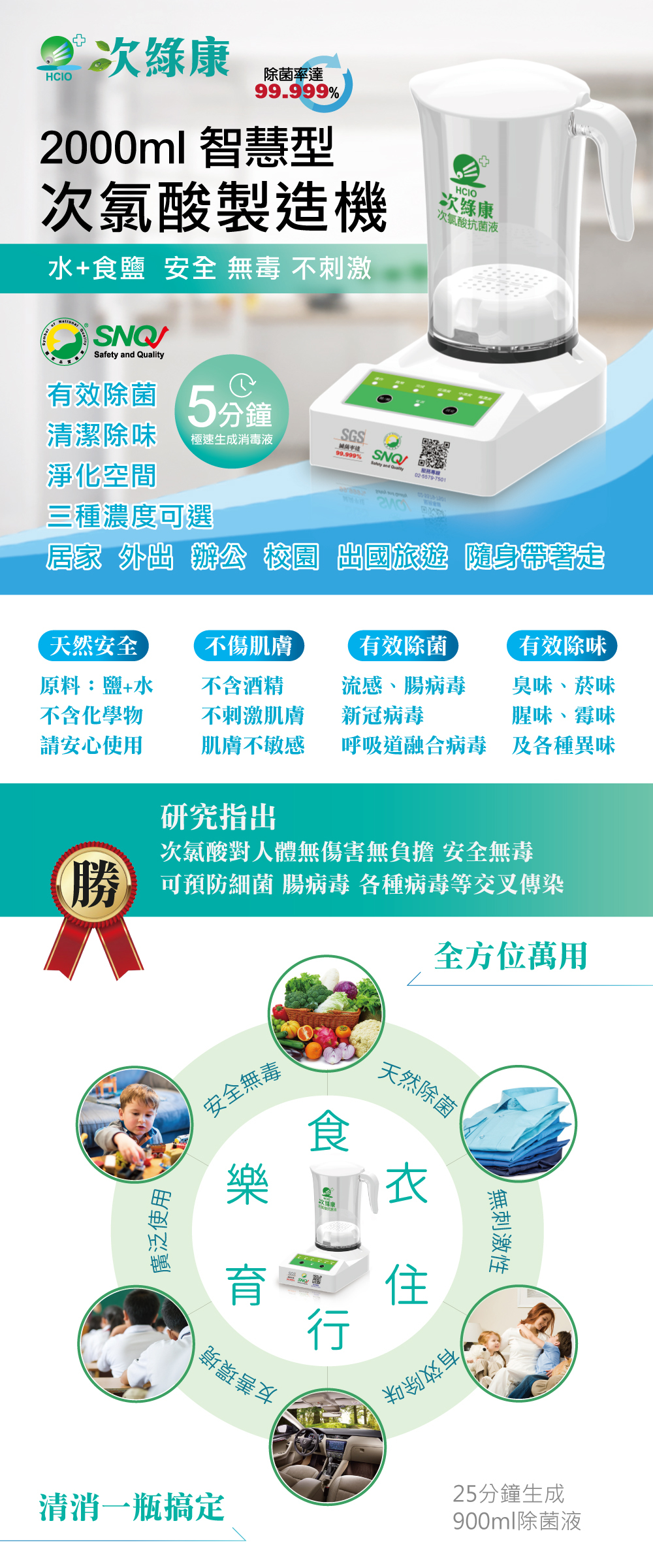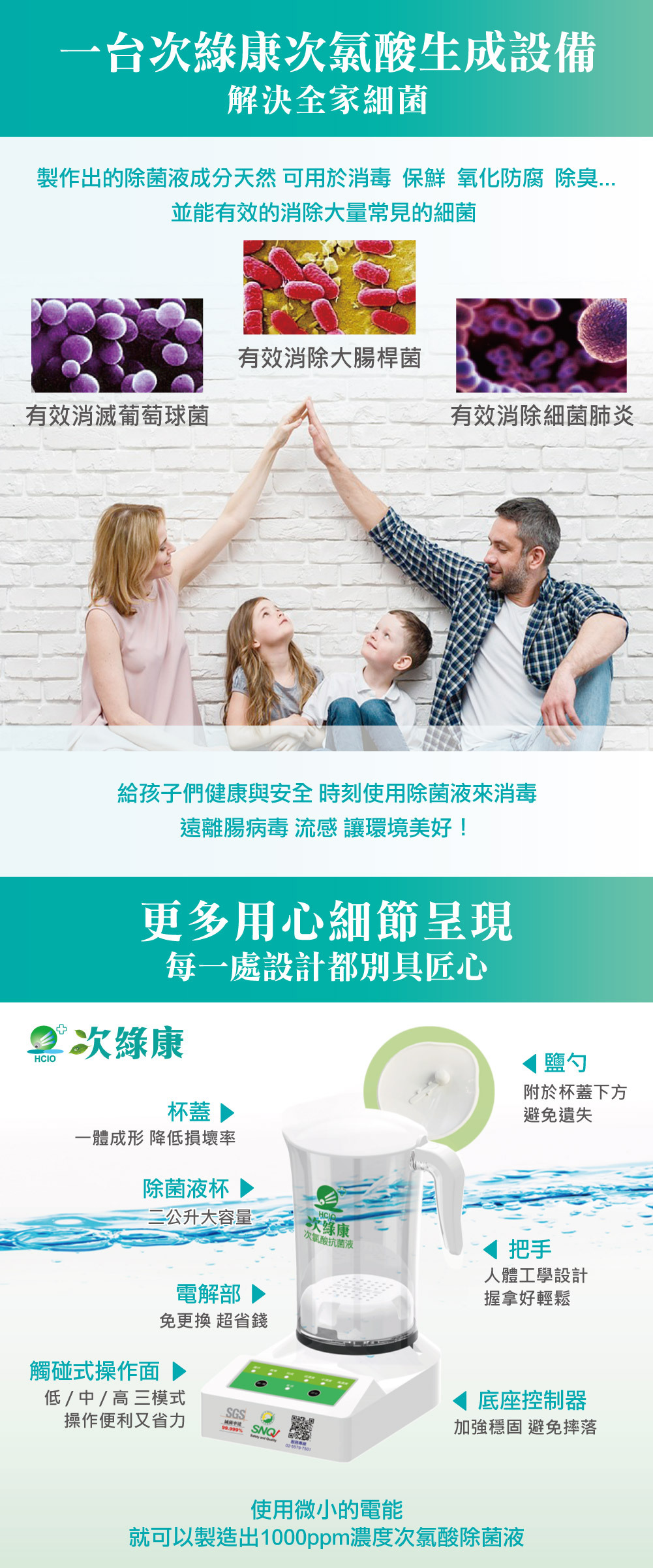 | 使用方式 | 加入1000cc水及兩匙食鹽,依照喜好設定濃度,按下啟動按鍵,即可製作除菌液 |
