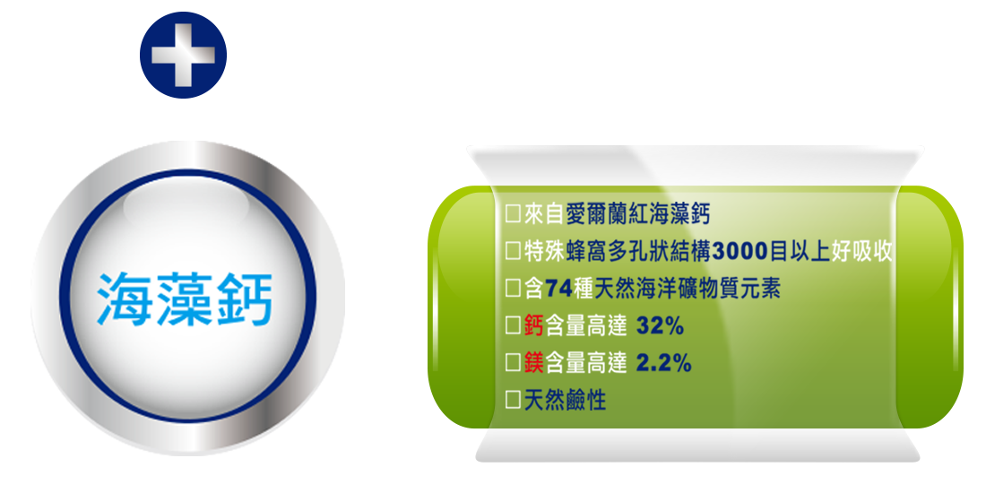 | 商品成分 | 海藻鈣350mg、橄欖抽出物100mg、膠原蛋白複合物40mg、硬脂酸鎂5mg、二氧化矽5mg |